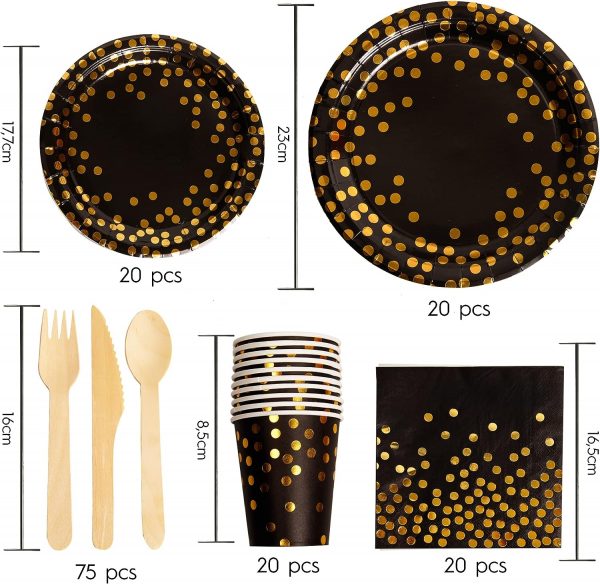 Vaisselle Jetable en carton Anniversaire thème or/Noir , Assiettes Noir pois dorés, Serviettes en Papier Noir pois dorés et Gobelets Noir pois dorés, Fête Anniversaire Vaisselle Blanche or pour Fille/Femme